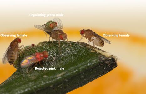 Two Females Watch a Copulating Green Male, While a Pink Male Is Rejected